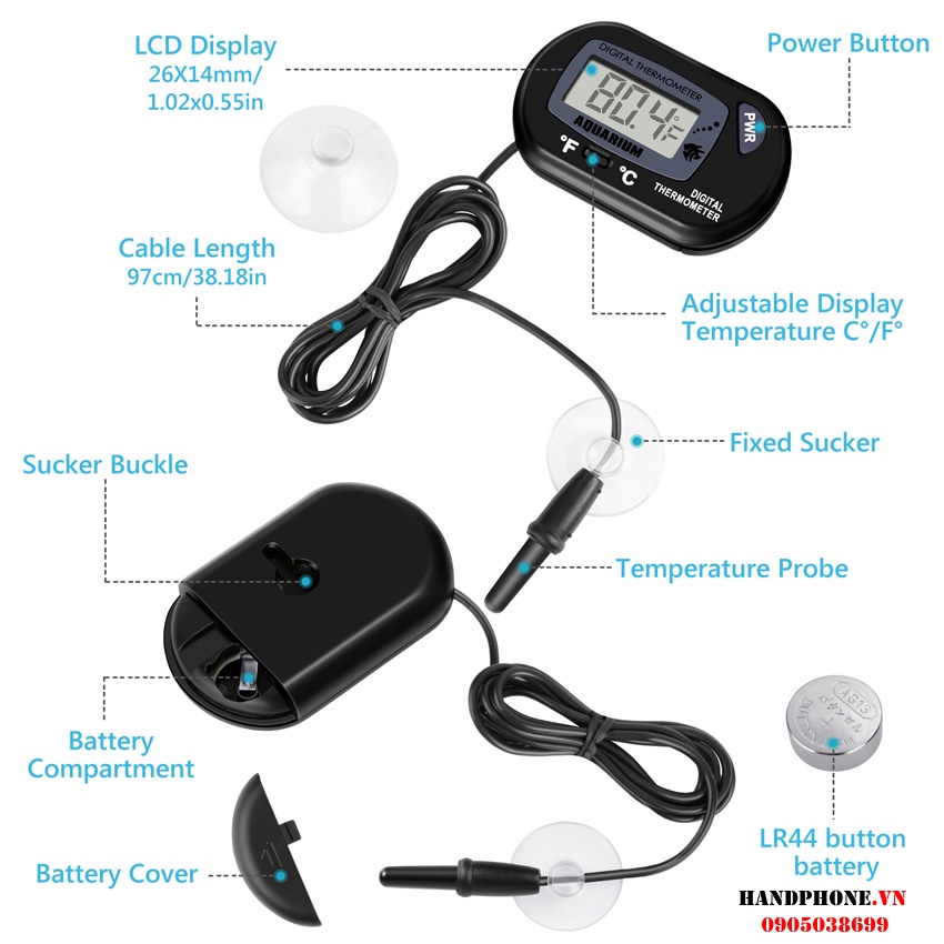 Nhiệt kế điện tử -50 độ C ~100 độ C sử dụng pin lithium có tuổi thọ bền và dễ dàng thay thế.