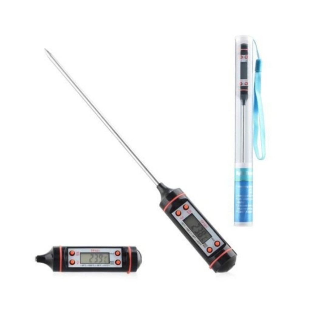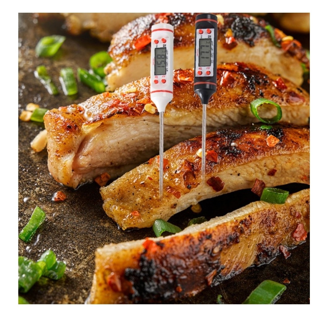 Nhiệt kế đo chất lỏng với đầu đo dài và nhạy bén, có thể đo nhiệt độ nước sôi, hoặc sữa, hoặc các loại chất lỏng khách nhau. Quý khách có thể đo nhiệt miếng thịt bằng cách chọc vào bằng đầu đo và bấm nút đo.--------------------------------