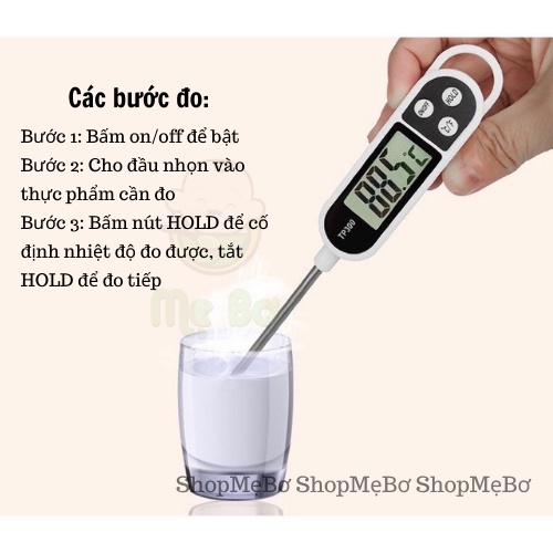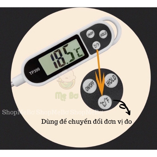 + Cho đầu que nhọn vào thực phẩm cần đo nhiệt độ