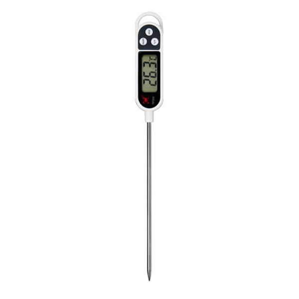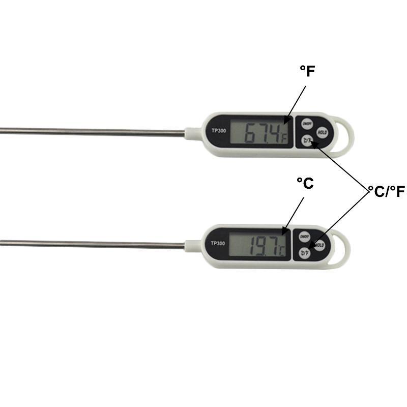 Que đo nhiệt độ có chiều dài khoảng 20cm. Trong đó 2/3 chiều dài của thiết bị là que kim loại để thu nhận thông số nhiệt độ từ thực phẩm. Thiết kế từ kim loại sẽ giúp cho việc thu nhận nhiệt độ nhanh và chính xác hơn, hạn chế tối đa sai số. Đầu còn lại trên nhiệt kế điện tử TP300 là màn hình LCD, để hiển thị nhiệt độ. Màn hình sẽ được kích hoạt bởi 1 phím on/off nằm kế bên. Ngoài phím nguồn, nhiệt kế còn trang bị thêm nút thay đổi thang đo giữa ˚C và ˚F và phím khóa giá trị đo được