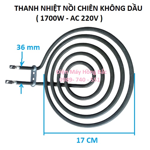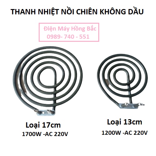 Nồi chiên không dầu là sản phẩm được sử dụng rỗng rãi và được rất nhiều gia đình sử dụng. Trên thị trường có nhiều hãng sản xuất nồi chiên không dầu khác nhau nhưng vòng nhiệt ( thiết bị làm nóng ) chỉ có bốn loại thông dụng dưới đây:- Vòng nhiệt kim loại (KL) : có 2 loại đường kính 13cm và 17cm tương ứng với công suất 1200W và 1700W điện áp đầu vào AC 220V