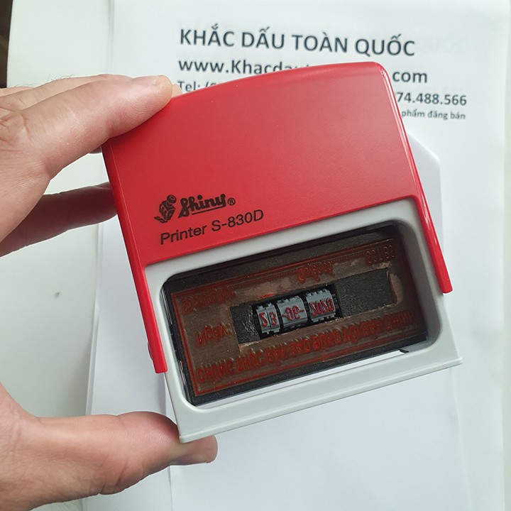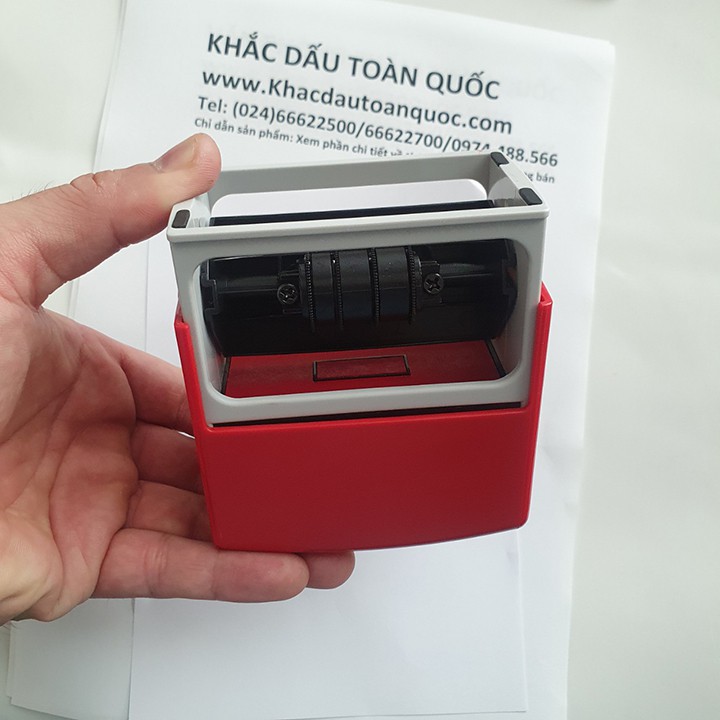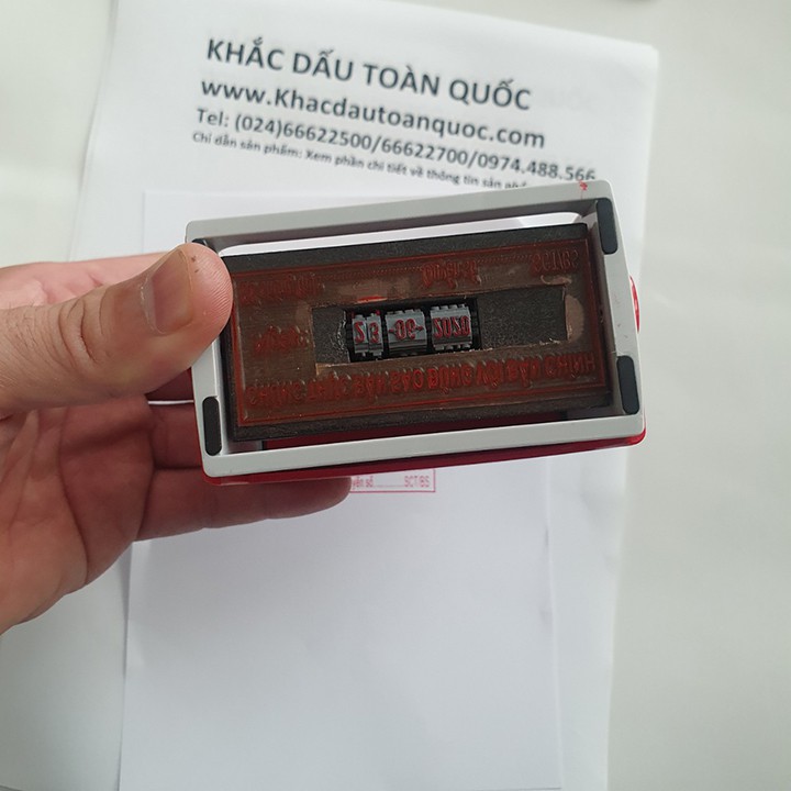 –– Đặc điểm con dấu: Con dấu này là con dấu hộp mặt dấu hình chữ nhật, ở giữa là ngày tháng năm thay đổi được bằng cách xoay tay ngày, tháng, năm để chọn phù hợp, Xung quanh là nội dung theo yêu cầu ( Nội dung này bắt buộc phù hợp với size con dấu, không phải nội dung bao nhiêu cũng được), Con dấu sử dụng mực dấu thông thường và chỉ dập trên giấy.
