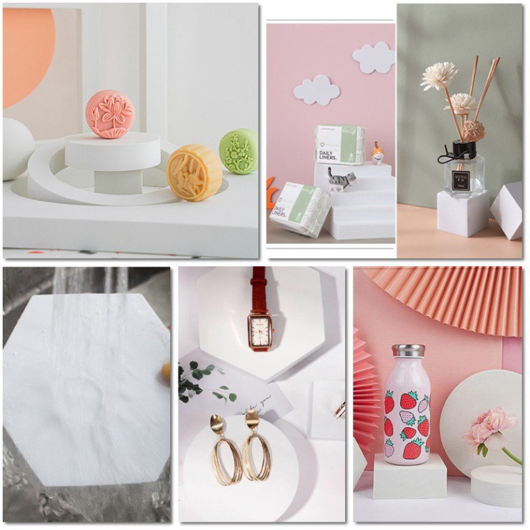 Khối hình học phù hợp khi chụp với các sản phẩm nhỏ như: Mỹ phẩm, trang sức, nước hoa, son môi, mắt kính, đồng hồ. Có thể kết hợp cùng các loại phông nền và #phụ-kiện như tấm #gương, #tượng, #hoa, #lá..