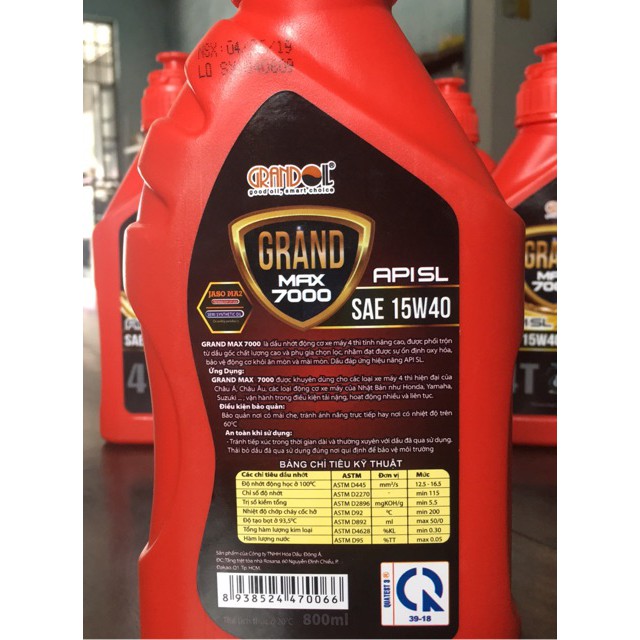 ầu nhớt Grand Max 7000 4T 15w40 1L được sử dụng cho động cơ 4 thì cùa xe máy, và sự phối trộn từ dầu gốc chất lượng cao và phụ gì chọn lọc, nhằm sự ổn định oxy hóa, bảo vệ động cơ khỏi ăn mòn và mài mòn. Đáp ứng hiệu năng API SL.Thiết kế đặc biệt cho động cơ 4 thì hiện đại cho các loại xe Châu Á, Châu Âu, các loại xe của Nhật Bản như Honda, Yamaha, Suzuki…. Hoạt động ở nhiều chế độ vận hành (tốc độ cao,tải trọng tối đa và tải trọng động lực). Đảm bảo hoạt động trơn tru của bộ li hợp ướt và khô. Cùng với các thành phần tẩy rửa tiên tiến, động cơ giảm thiểu được lượng chất thải đến mức tối đa, khởi động dễ dàng , tăng tốc nhanh, tiết kiệm nhiên liệu. Sử dụng thích hợp cho các loại xe gắn máy 4 thì.Thông số kỹ thuật: