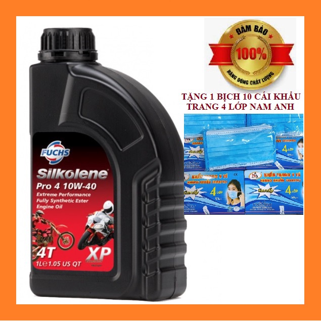 Nhớt Fuchs Silkolene Pro 4 10W40 XP 1L nhập khẩu từ Đức, được chế tạo để đáp ứng nhu cầu của cả động cơ 4 thì làm mát bằng không khí và nước, Nhớt Fuchs Silkolene Pro 4 10W40 XP 1L là loại cấp độ nhớt được khuyến nghị cho phần lớn các nhà sản xuất xe máy.