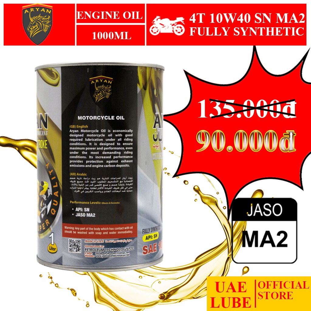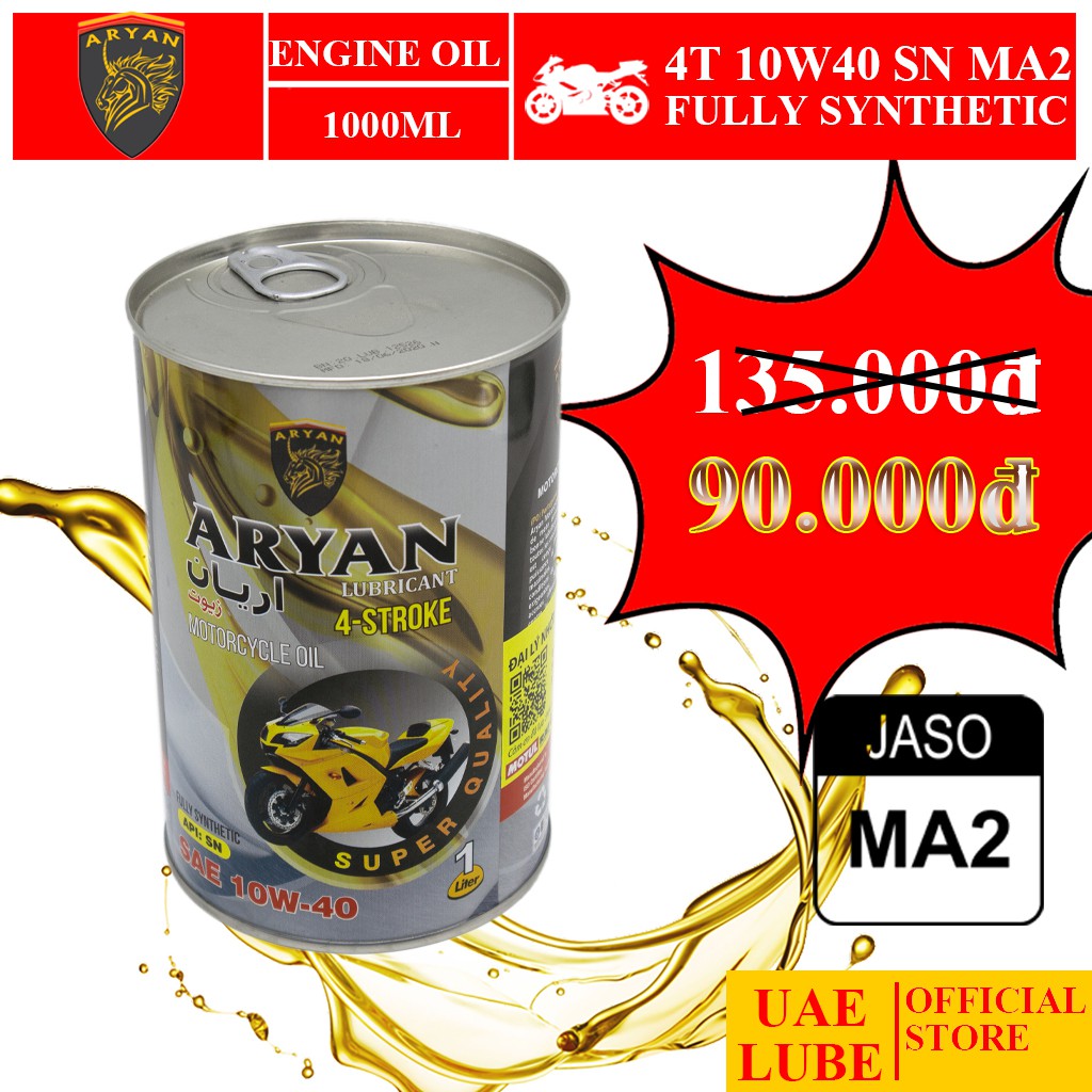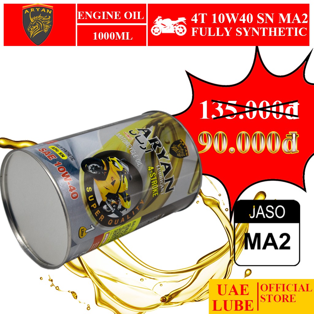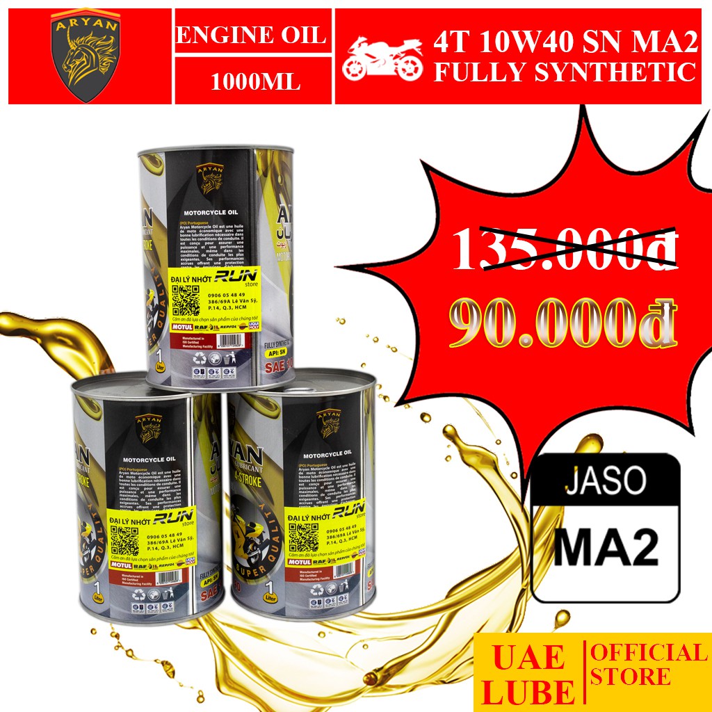Ô tô > Dầu nhớt và phụ gia ô tô > Mỡ & Chất bôi trơn || Nhớt Lon Tổng Hợp ARYAN 4T 10W40 1000ml MA2 - Nhập Khẩu UAE - ARYAN FULLY SYNTHETIC SAE 10W40 JASO MA2 API SN 1000MLCòn hàng