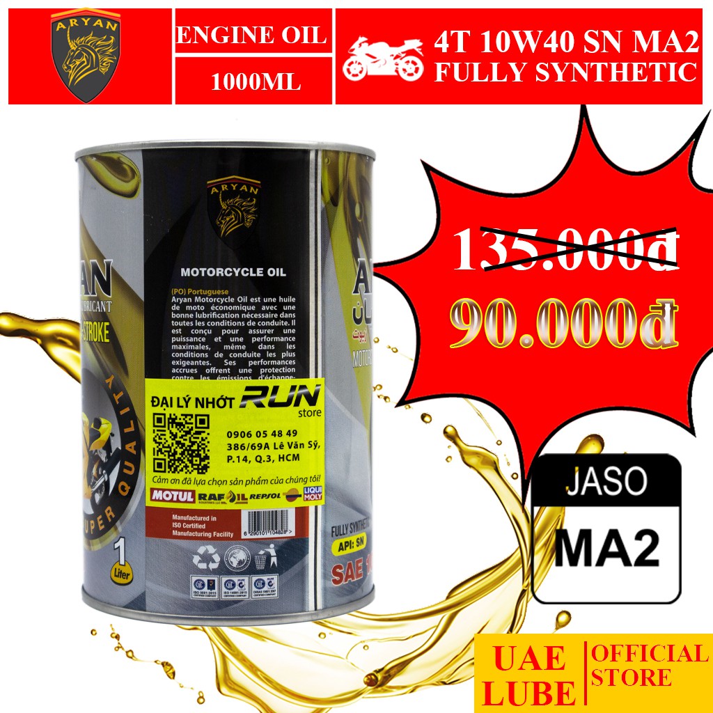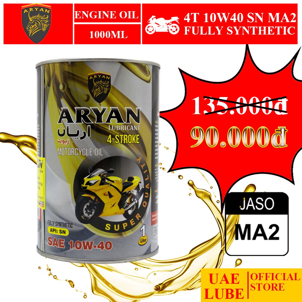 Giới thiệu Nhớt Lon Tổng Hợp ARYAN 4T 10W40 1000ml MA2 - Nhập Khẩu UAE - ARYAN FULLY SYNTHETIC SAE 10W40 JASO MA2 API SN 1000ML