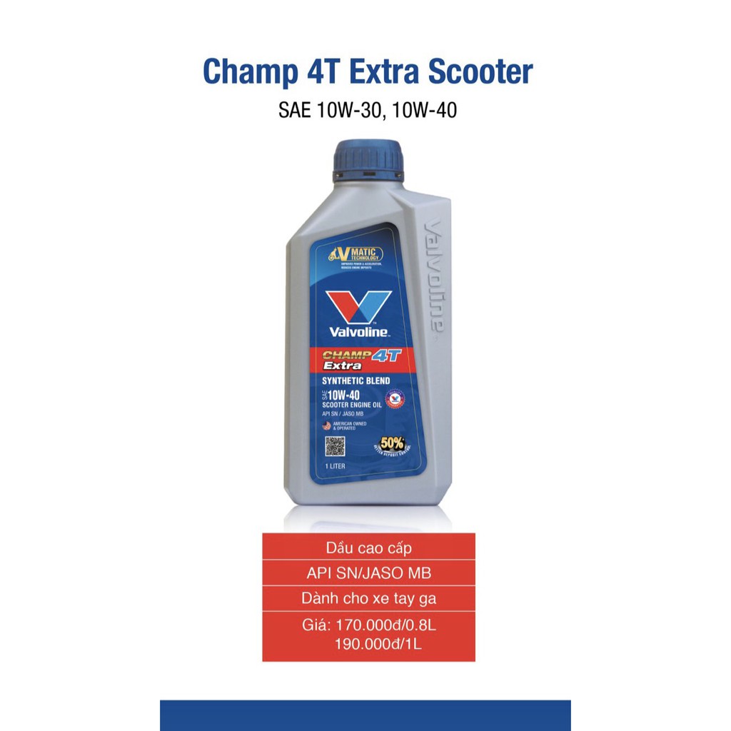 Ô tô > Dầu nhớt và phụ gia ô tô > Mỡ & Chất bôi trơn || Nhớt nhập khẩu tổng hợp VALVOLINE CHAMP 4T EXTRA SCOOTER 0.8LCòn hàng