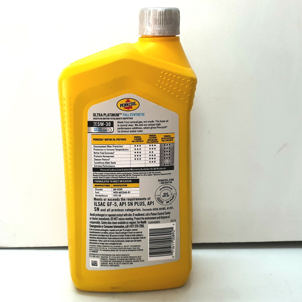 Nhớt Pennzoil Ultra Platinum 4T 5w30( 1QUARZT=946ML) SẢN XUẤT TẠI MỸ.Tại thị trường Mỹ, Pennzoil Platinum là loại dầu nhớt duy nhất có chương trình bảo hành miễn phí 15 năm hoặc 800.000 km cho 15 thành phần chính của động cơ. Đặc biệt chương trình này vẫn được tiếp tục chuyển nhượng xe sang chủ mới với điều kiện người chủ mới tiếp tục sử dụng nhớt Pennzoil Platinum cho xe của mình.