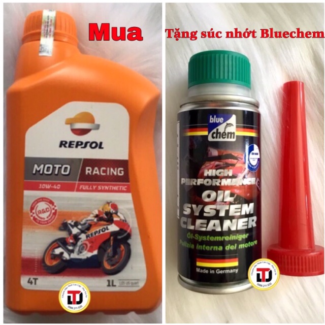 Mua 1 Repsol Racing 10W40 tặng Súc động cơ Bluechem💥 Sản phẩm Repsol Moto Racing 10W40 4T có khả năng thích nghi cao, độc đáo, phù hợp với hầu hết các loại xe và các loại động cơ 4 thì. Nhớt giúp giảm nhiệt tốt, cải thiện tốt sức mạnh và độ bền của động cơ.