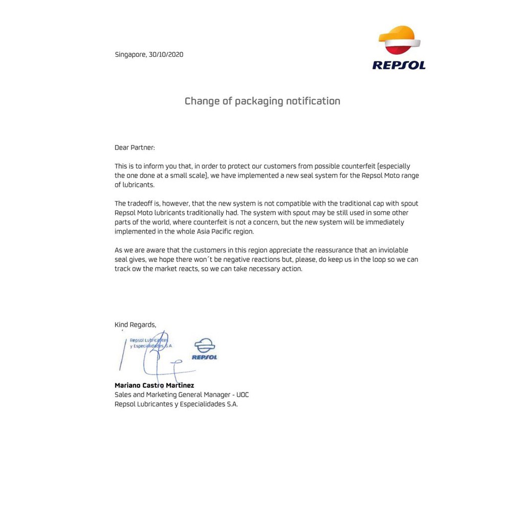 2/ Sản phẩm Repsol Racing về mẫu chai, tem mác, chất lượng bên trong đều không thay đổi ( điều này được thể hiện qua văn bản chính thức của Repsol, không phải cảm nhận của bất kỳ cá nhân nào)