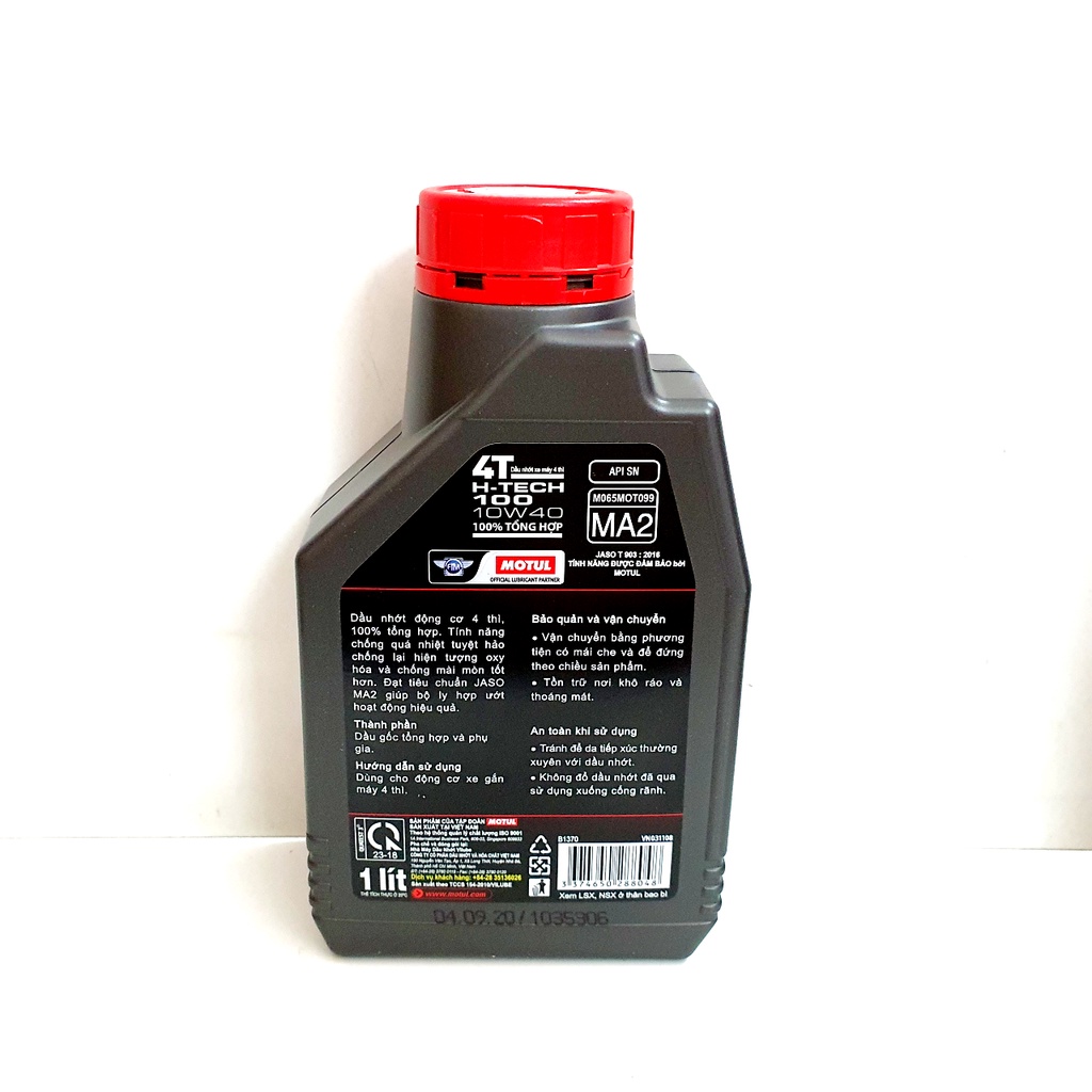 Motul H-Tech 100 4T 10W40 là sản phẩm dầu nhớt chính hãng dành cho xe máy động cơ 4 thì của tập đoàn Motul – nhà sản xuất dầu nhớt hàng đầu của Pháp. Motul H-Tech 100 4T 10W40 đã được nhiều hãng xe máy uy tín tín nhiệm và khuyên dùng trong thời gian qua, chứng tỏ khả năng vượt trội của sản phẩm dầu nhớt này đối với phương tiện đi lại tại nước ta, không chỉ bôi trơn động cơ giúp xe vận hành êm ái mà còn bảo vệ chiếc xe máy của bạn bền bỉ theo thời gian.