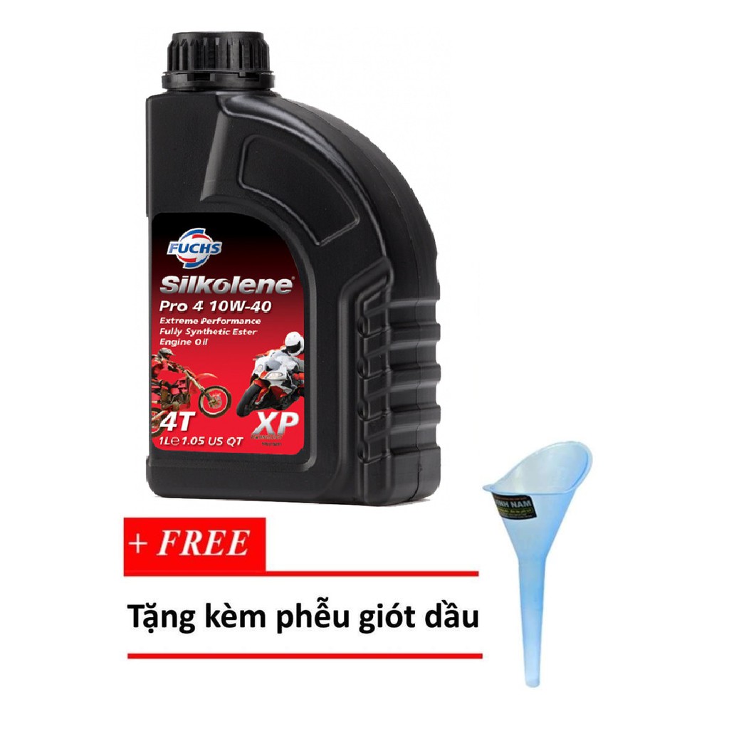 Fuchs Silkoline Pro 10W-40 XP 4T 1L Tặng Phuể giót nhớt cao cấpNhớt Fuchs Silkolene Pro 4 10w40 XP 4T 1L nhập khẩu từ Đức, được chế tạo để đáp ứng nhu cầu của cả động cơ 4 thì làm mát bằng không khí và nước, Pro 4 10W-40 XP là loại cấp độ nhớt được khuyến nghị cho phần lớn các nhà sản xuất xe máy.