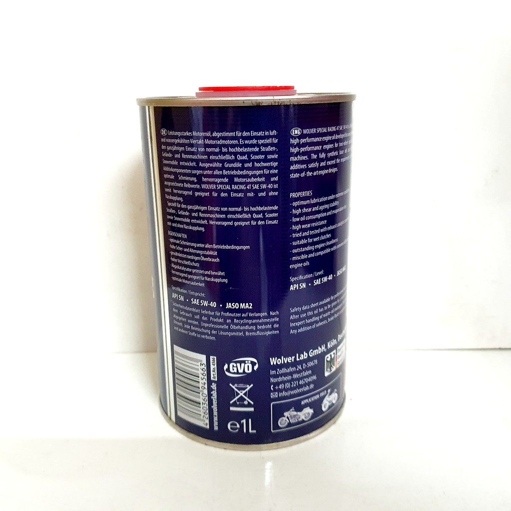 Nhớt tổng hợp siêu cao cấp cho moto,côn tay,xe tay ga.. Wolver Special Racing 5w40Wolver Special Racing 5W40 SN là phiên bản đặc biệt của dòng sản phẩm nổi tiếng Wolver Racing chỉ phân phối giới hạn tại một số thị trường trọng điểm trên thế giới. Đây là loại dầu tổng hợp với hệ phụ gia được thiết kế chuyên dụng cho động cơ xe phân khối lớn, xe số và xe tay ga 4 thì. Sản phẩm có chu kỳ sử dụng khuyến cáo lên đến 5000 km, phù hợp với các tour đường trường không nghỉ, địa hình đồi dốc cho tới các vùng đồi cát đầy nắng, gió và muối biển.