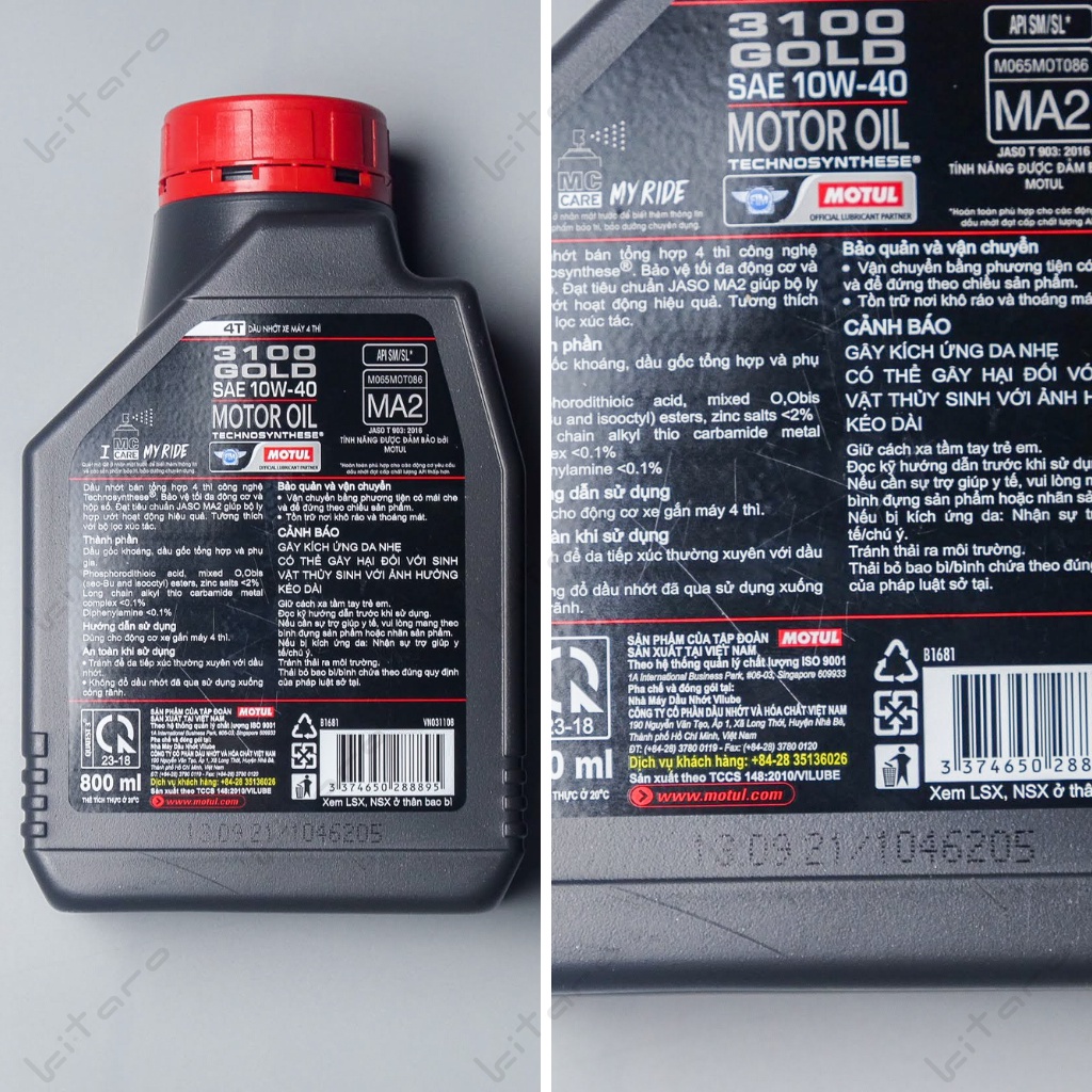 Thông số kỹ thuật của dầu nhớt Motul 3100 Gold 0.8L:- Hãng sản xuất: Motul đến từ Pháp.