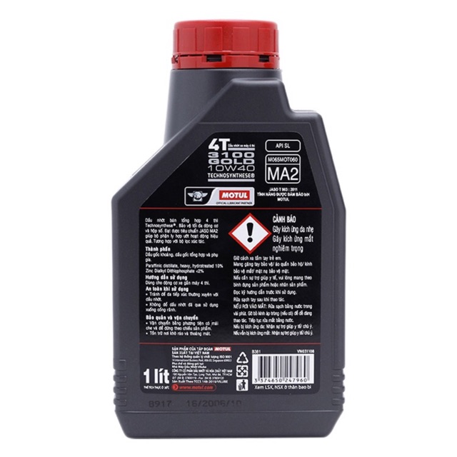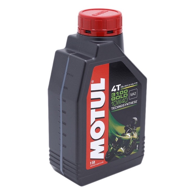 Motul 3100 Gold 10W40 1L nhớt cao cấp chuyên dùng cho các loại xe số, xe tay côn như: Exciter 150, Exciter 135, Yamaha FZ150i, Yamaha R15, Su En-150, Axelo, Raider 150, Sonic 150 v.v… rất phù hợp với các dòng xe số như: Sirius RC Fi 2014, Sirius R, Jupiter RC Fi 2014, Wave RSX v.v….Nhớt Motul 3100 Gold 10W40 1L được nhập chính hãng từ Tập đoàn nhớt MOTUL tại Pháp. Đây cũng là loại nhớt cao cấp nhất dành cho xe số đang rất nhiều biker tin dùng trong thời gian gần đây, và nhận được nhiều phản hồi tích cực từ các khách hàng sau 1 thời gian sử dụng, xe hoạt động êm ái và bốc hơn rõ rệt, thời gian sử dụng lâu hơn, khoảng 3000km mới cần thay nhớt mới…