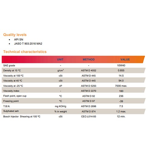 REPSOL RACING 4T 10w40 FULLY SYNTHETICTiêu chuẩn kỹ thuật: JASO MA2 | API SN | SAE 10w40