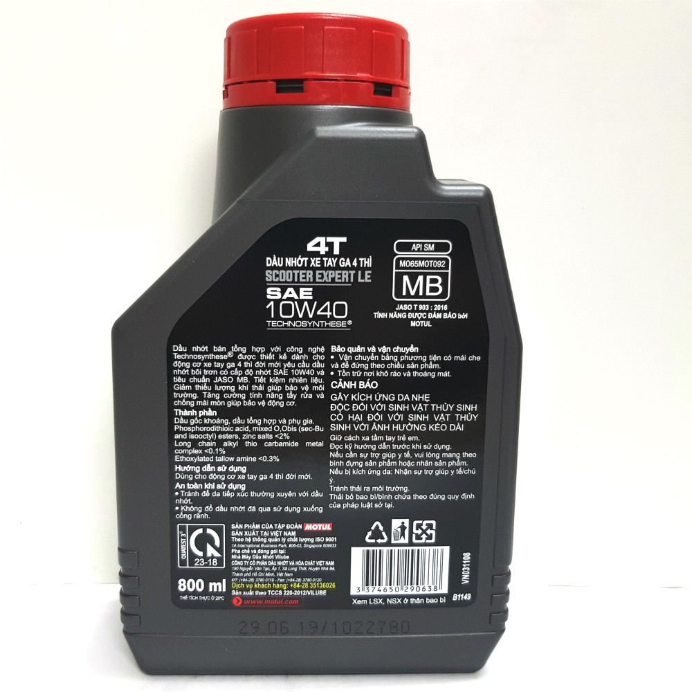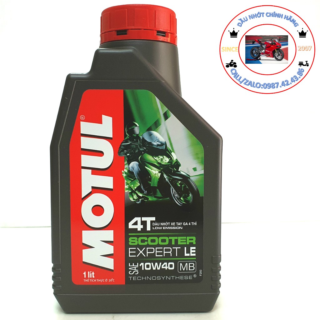 NHỚT XE TAY GA CAO CẤP MOTUL EXPERT LE 800MLMotul Scooter Expert LE 10W40 0.8L đến từ hãng dầu nhớt Motul danh tiếng tại Pháp, là sản phẩm dầu nhớt chính hãng đặc biệt dành cho xe tay ga 4 thì đời mới. Motul Scooter Expert LE 10W40 0.8L tự hào được nhiều nhà sản xuất xe khuyến cáo nên dùng cho các động cơ xe tay ga mới hiện nay.
