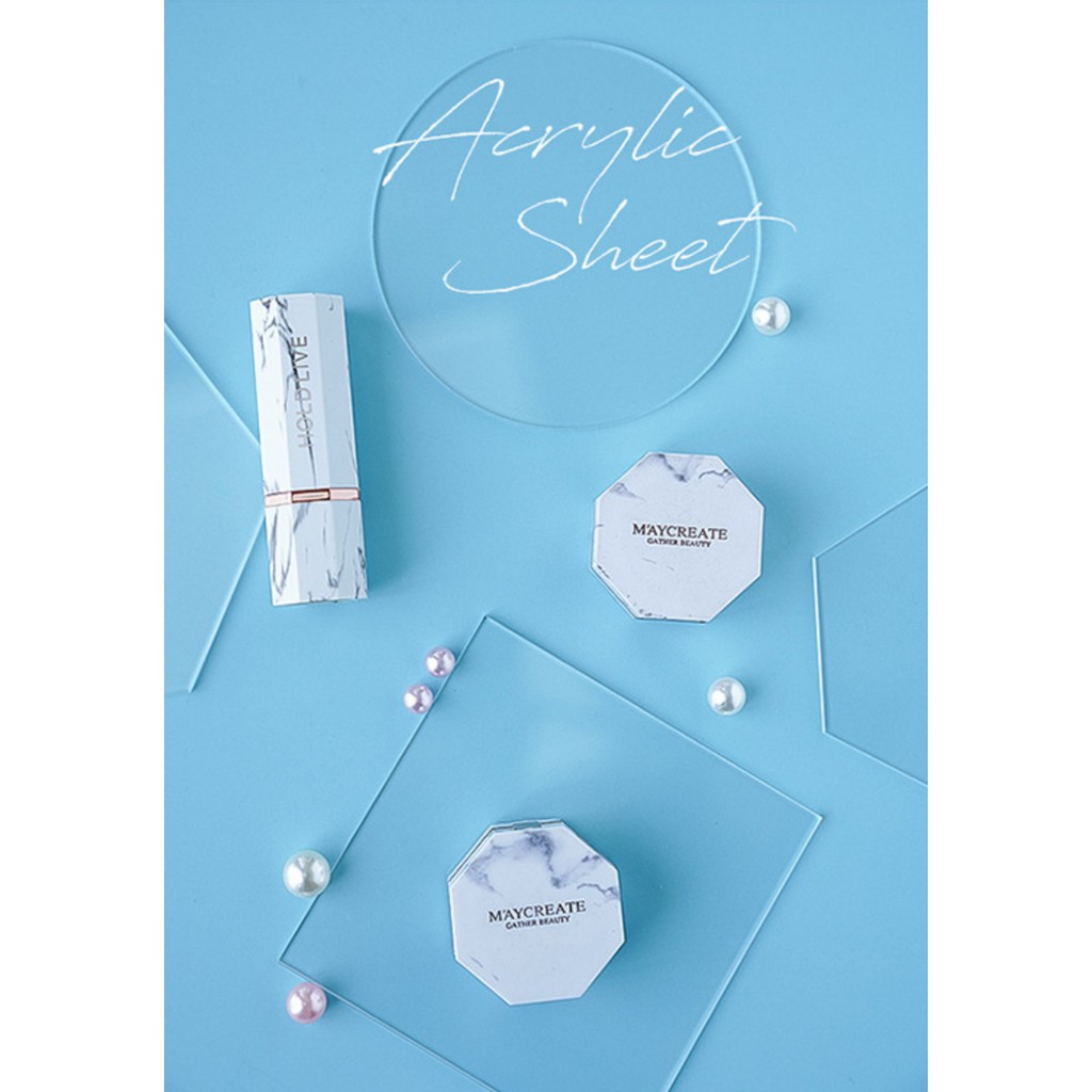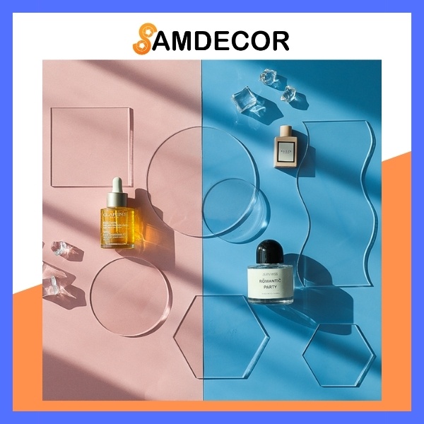 Nhựa Acrylic trong suốt làm phụ kiện chụp ảnh sản phẩmMiếng hình học trong suốt có thể kết hợp với Nền giấy màu, quạt giấy, khối hình học, hoa mẫu đơn, đá giả, lá bạch đàn,….