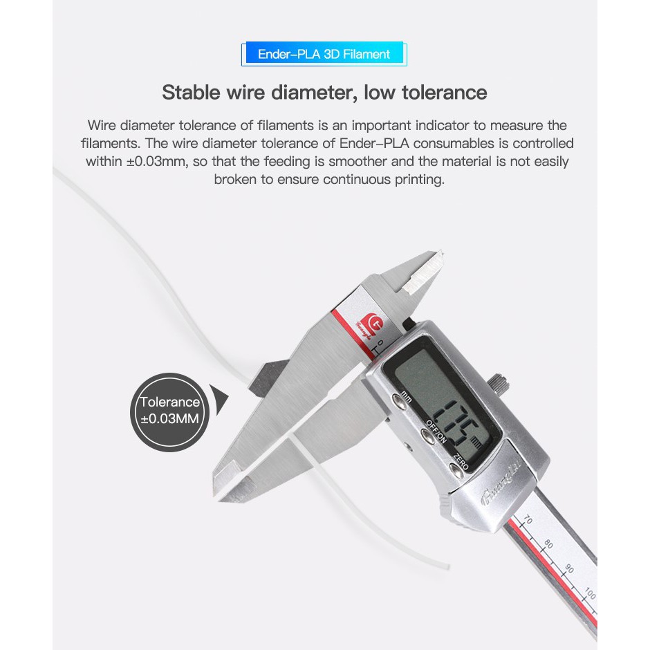 Dung sai đường kính của dây tóc là một chỉ số quan trọng. Dung sai của dây tóc Ender- PLA 1,75mm được kiểm soát trong khoảng ± 0,03mm, giúp cho việc thay nhựa in trơn tru hơn và đảm bảo tính liên tục khi in