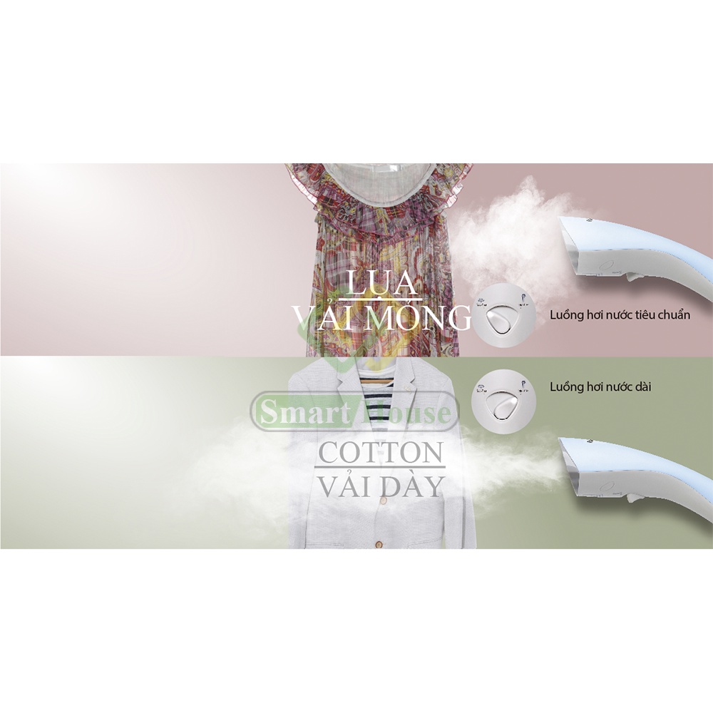 - Kiểu bàn ủi hơi nước đứng hiện đại, có thể ủi đồ ngay trên móc áo giúp chị em nội trợ ủi đồ nhanh, tiết kiệm thời gian, công sức tối đa