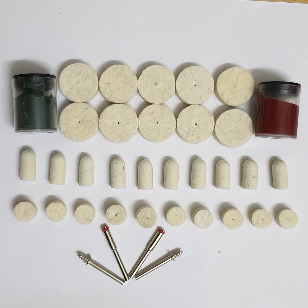 Nhà cửa & Đời sống > Dụng cụ & Thiết bị tiện ích > Dụng cụ > Giấy nhám, máy chà nhám và phụ kiện || Bông nỉ trắng đánh bóng chân cán cốt 3mm (30 đầu nỉ + 2 lọ bột bóng + 4 cán cốt 3ly)Còn hàng