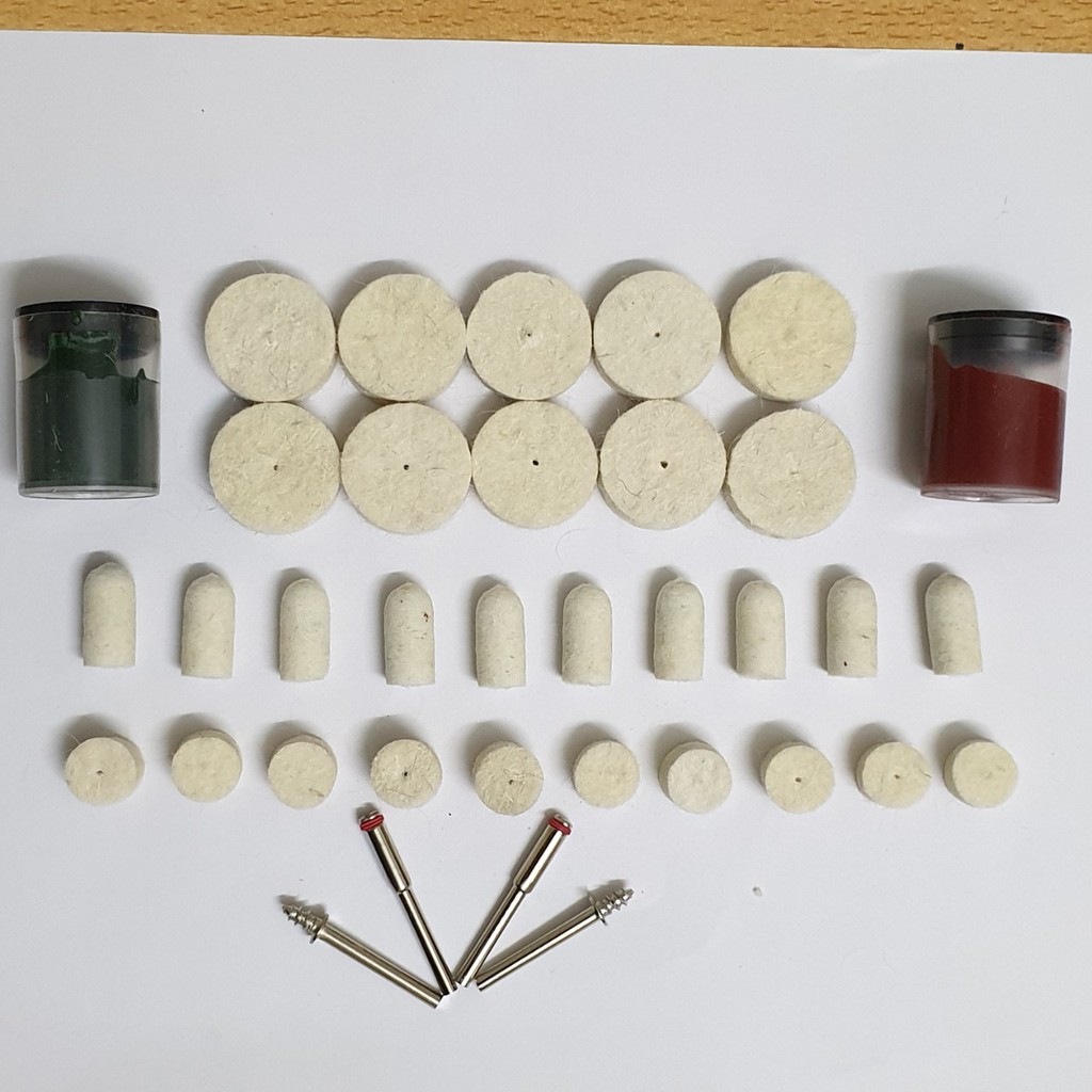 Nhà cửa & Đời sống > Dụng cụ & Thiết bị tiện ích > Dụng cụ > Giấy nhám, máy chà nhám và phụ kiện || Bông nỉ trắng đánh bóng chân cán cốt 3mm (30 đầu nỉ + 2 lọ bột bóng + 4 cán cốt 3ly)Còn hàng
