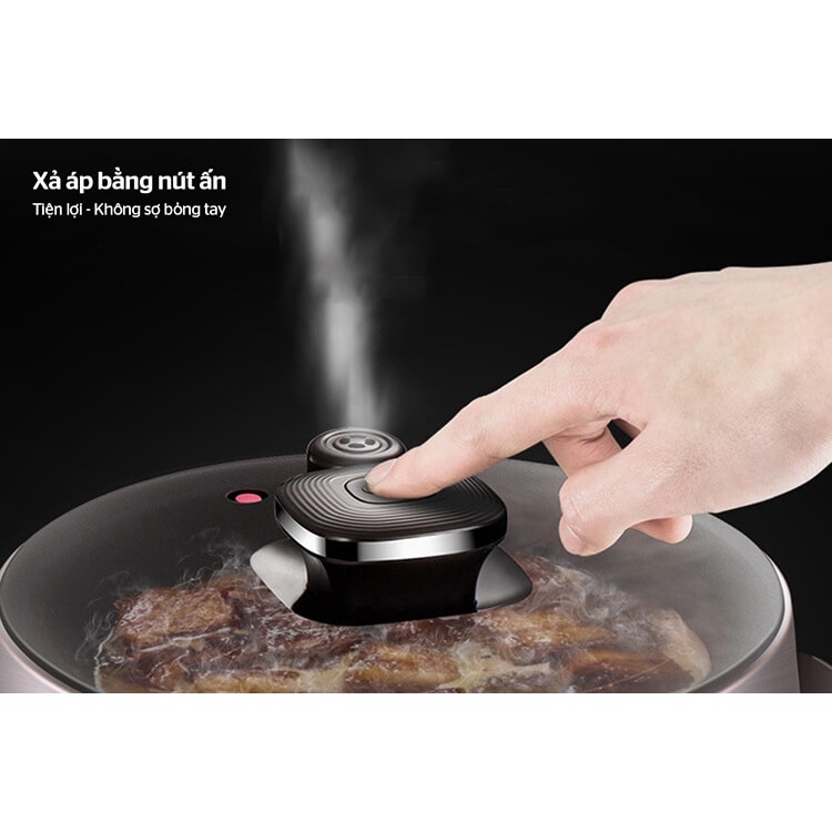 Đối với nồi áp suất điện tử SUNHOUSE SHD1570, để xả áp bạn chỉ cần ấn nút trên nắp nồi. Nút ấn này cách xa van xả nên tuyệt đối không lo hơi nước phì ra gây bỏng, đảm bảo an toàn cao cho người sử dụng.
