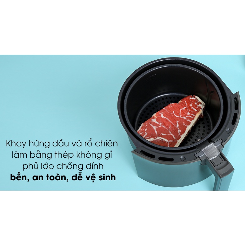 Khay hứng dầu và rổ chiên làm bằng thép không gỉ chống dính hạn chế dính cháy, an toàn khi nấu nướng, dễ dàng vệ sinh