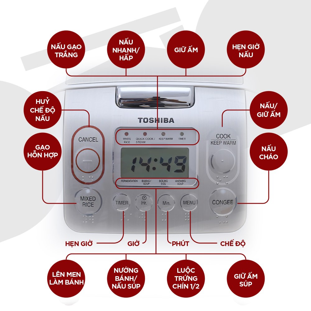• Chức năng nấu: Nấu cơm, Hâm nóng, hâm soup, nấu cháo, nấu nhanh, nấu súp, hấp, luộc trứng, lên men, làm bánh