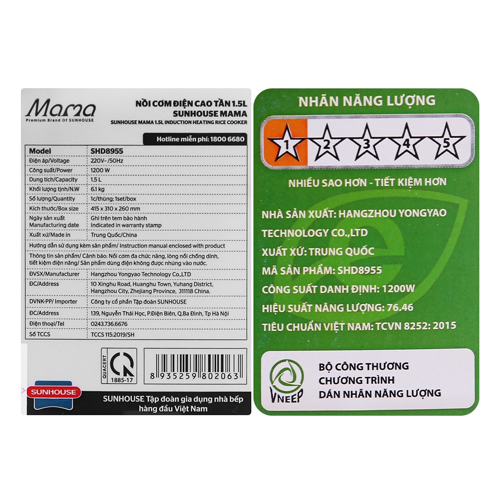 Thiết Bị Điện Gia Dụng > Đồ gia dụng nhà bếp > Nồi cơm điện || [Mã ELMALL150 giảm 8% đơn 500K] Nồi cơm điện cao tần Sunhouse Mama 1.5 lít SHD8955Còn hàng
