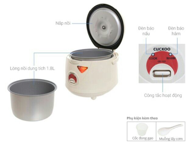 Nồi cơm điện CUCKOO CR1021 thiết kế nhỏ gọn, màu sắc trang nhã.- Nồi có dung tích 1,8 lít phù hợp với gia đình từ 4-6 người.