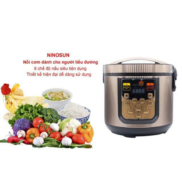 Nồi cơm điện tách đường NINOSUN giúp loại bỏ đường trong quá trình nấu cơm. Loại bỏ thành phần Amylopectin của tinh bột, giảm chỉ số Gl và lượng calories trong tinh bột.Lòng nồi lõi thép kép Inox 304, vỏ nhựa nguyên sinh bền chịu lực, chịu nhiệt.