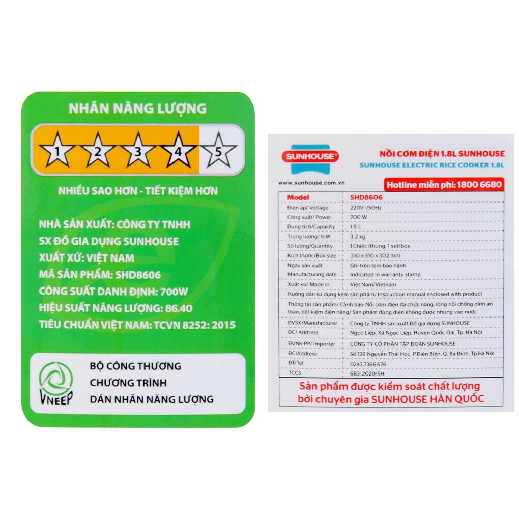 [Mã ELHADEV giảm 4% đơn 300K] Nồi cơm nắp gài Sunhouse SHD8606 1.8 lít