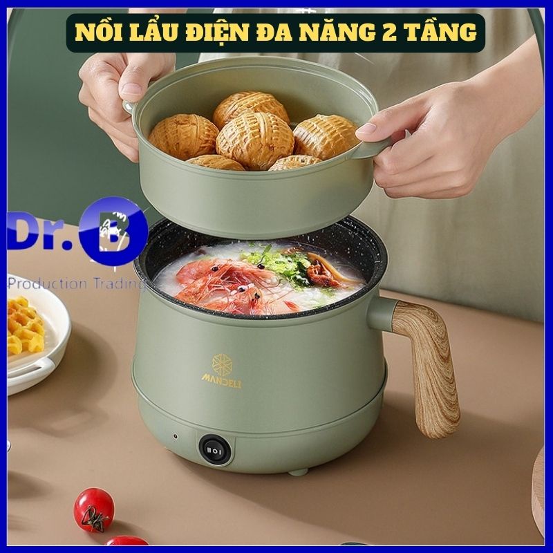 Nồi lẩu điện mini đa năng MANDELI kèm giá hấp GiadungDrB Nồi nấu mì, nấu cơm đa năng 1,6L