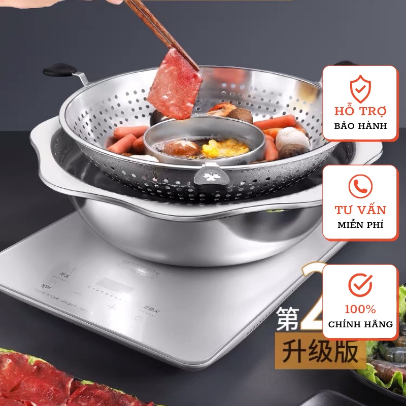 Đặc điểm nổi bật :- Với thiết kế cực kỳ thông mình và tiện lợi. Nồi chia làm 2 tầng và 2 khoang, đáp ứng được sở thích của cả gia đình. Với 2 khoang có thể dung nước cùng 1 lúc. Còn thiết kế 2 tầng với nồi cố định và 1 khay khi xoay lên thì có thể lọc được toàn bộ đồ ăn đã nhúng. Giờ thì các mẹ khi ăn khỏi phải lo ngồi vớt mà vẫn bị sót đồ ăn rồi ạ.