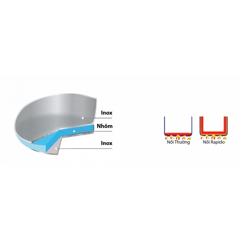 Công nghệ đáy nồi độc quyền của Rapido giúp nhiệt lượng phân bố đều trên khắp bề mặt đáy và thành nồi, rút ngắn thời gian nấu, tiết kiệm năng lượng. Phía trong đáy được đánh bóng giúp chống dính tốt hơn.