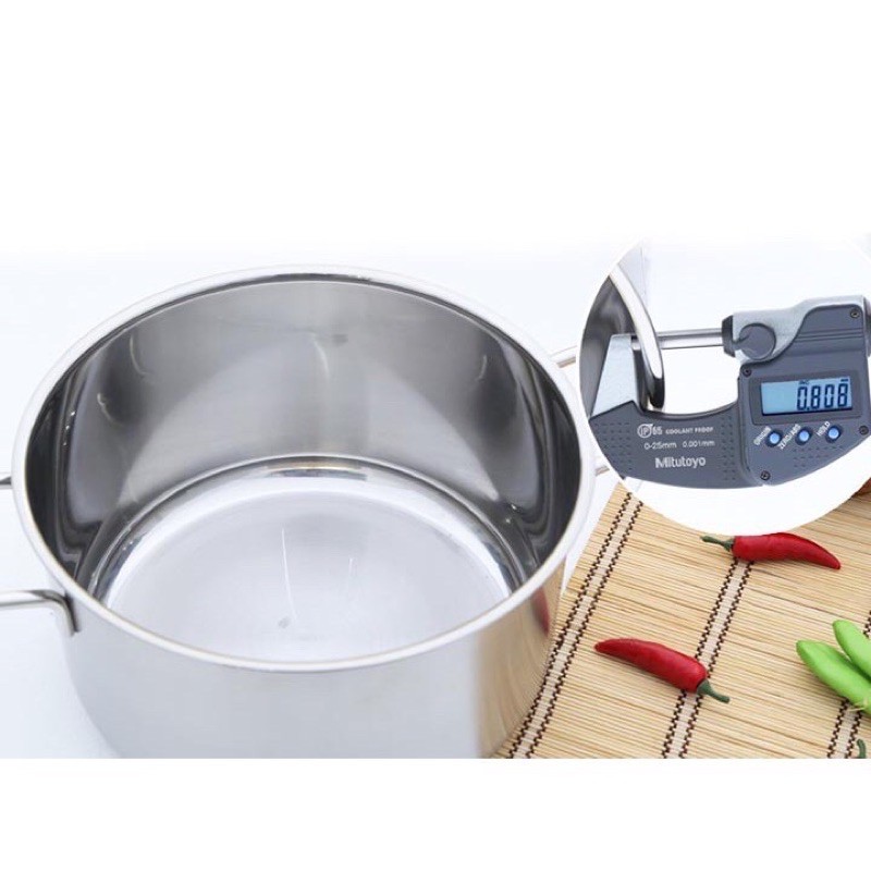 Nồi được làm bằng inox 430 nhập khẩu tại Hàn Quốc, không bị oxy hóa, không ra ten, đảm bảo an toàn vệ sinh thực phẩm, độ dày 0.8 mm.
