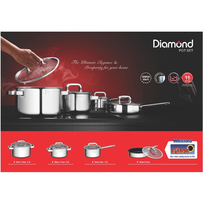 Giới thiệu Bộ Nồi 4 Chiếc Inox 304 3 Lớp Đáy Liền ELMICH Diamond EL3329 Size 16/20/24 Chảo 26cm