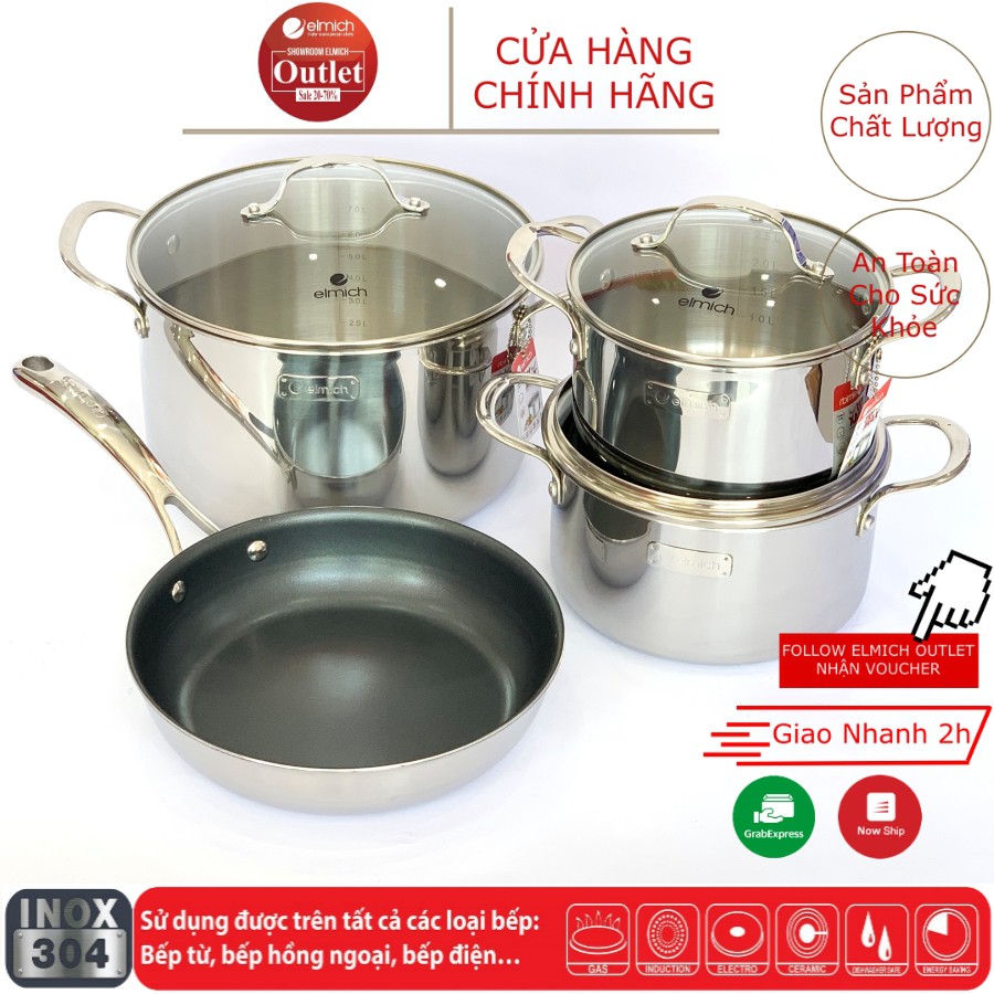 Giới thiệu Bộ Nồi 4 Chiếc Inox 304 3 Lớp Đáy Liền ELMICH Trimax 3742 Size 18/20/26 Chảo 26cm