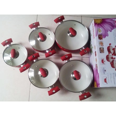 - Bộ 5 nồi hợp kim nhôm đáy từ tráng men Watashi thiết kế vung kính trong suốt giúp bạn dễ dàng quan sát thực phẩm khi đun nấu, đặc biệt vung còn có khả năng chịu lực và chịu nhiệt cực tốt, mang đến sự an tâm cho người nội trợ.
