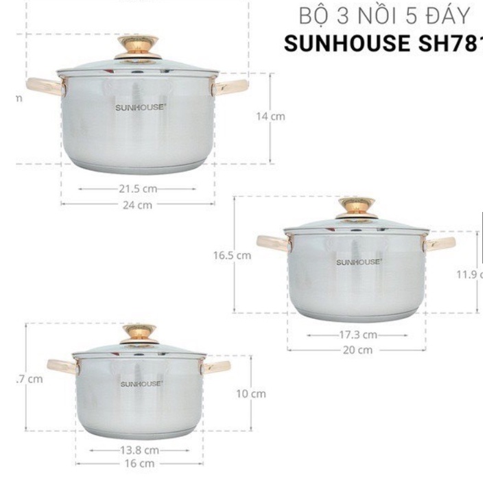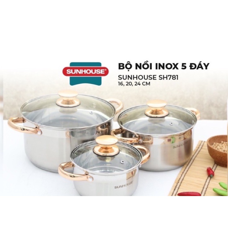 Bộ nồi inox 5 đáy SUNHOUSE SH781 sử dụng được với mọi loại bếp, kể cả bếp từ. Bộ sản phẩm gồm 3 nồi với đường kính 16cm - 20cm - 24cm phù hợp với nhu cầu nấu nướng của mọi gia đình. Nồi nhỏ 16cm thích hợp để luộc trứng, kho thịt, nồi cỡ trung 20cm để nấu canh cho 2-4 người và nồi lớn 24cm có thể luộc gà, nấu canh hoặc lẩu cho 3-5 người.