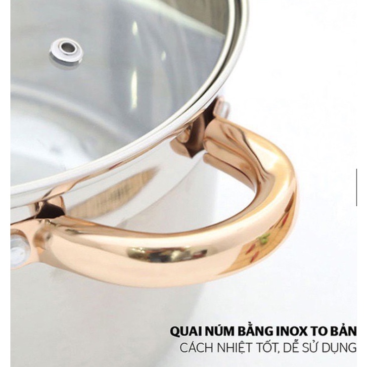 Quai nồi: inox mạ vàng sang trọng, tán đinh chắc chắn, chịu nhiệt, cách nhiệt tốt