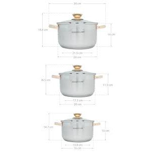 Bộ 3 nồi inox 5 đáy Sunhouse SH781 thương hiệu Sunhouse – Việt Nam, sản xuất tại Việt Nam. Thiết kế nồi inox sáng bóng, kiểu dáng tinh tế với tay cầm và núm nắp bằng inox mạ vàng bắt mắt, sang trọng.