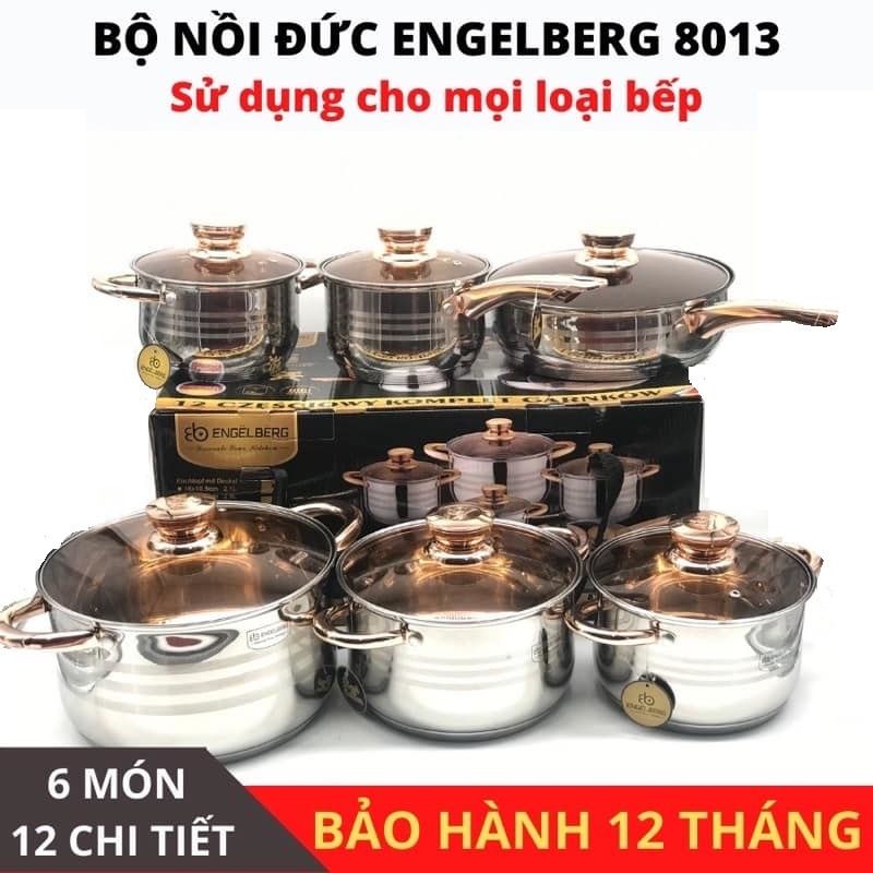 BỘ NỒI 6 MÓN 12 CHI TIẾT ANGELBERG 8013 ĐÁY TỪ 5 LỚP VUNG KÍNH===========