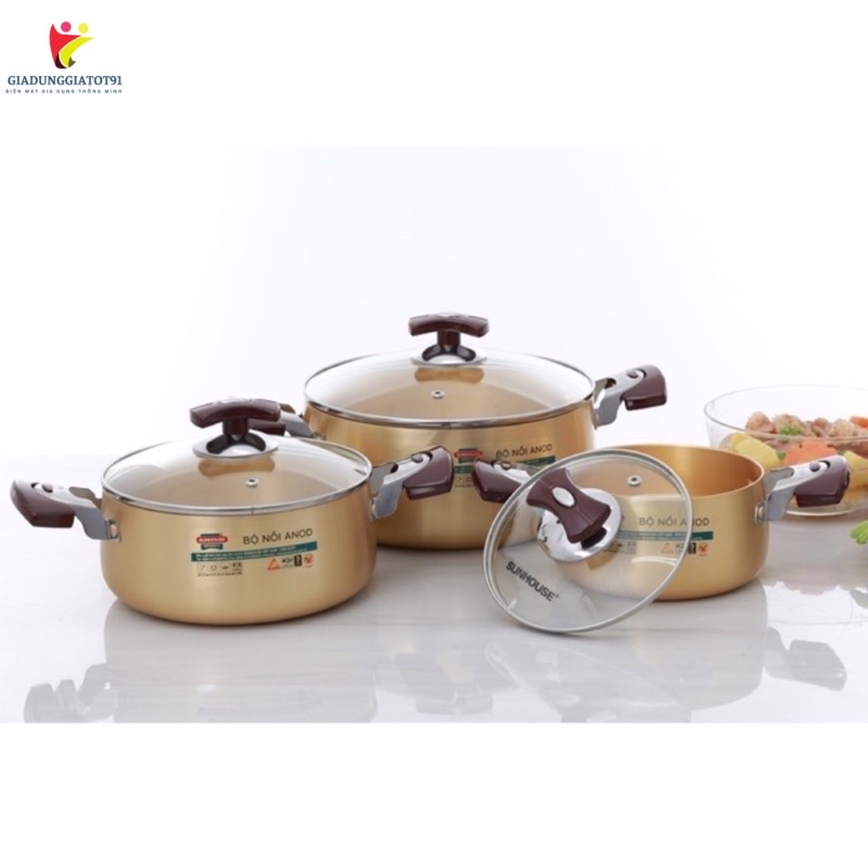 Bộ nồi Anod Sunhouse SH6634 bộ gồm 3 nồi 16 – 20 – 24cm chất liệu nhôm dùng bếp gas, bếp hồng ngoại