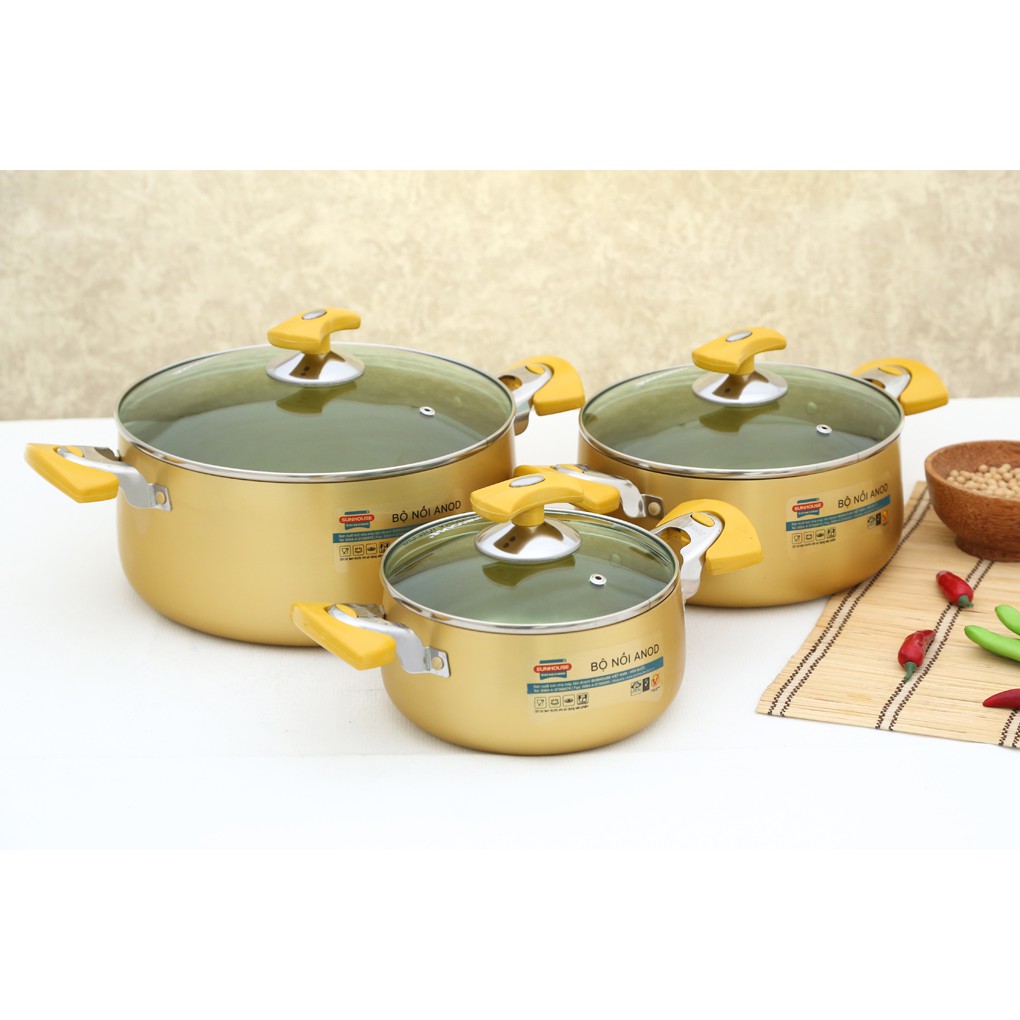 Kiểu dáng hiện đại, kết cấu bền chắc: Bộ nồi Anod SUNHOUSE được làm từ hợp kim nhôm Anod cứng bằng công nghệ tiên tiến giúp sản phẩm có độ cứng và bền vững cao, chống ăn mòn, chịu được nhiệt độ cao cũng như khả năng chống dính tốt. Vỏ ngoài màu vàng nổi bật, chịu nhiệt tốt, không biến màu theo thời gian.