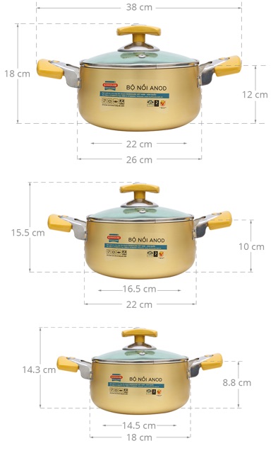 Đa dạng kích cỡ, phù hợp nhiều mục đích sử dụng: Bộ gồm 3 nồi Anod với những kích cỡ phổ biến 16cm – 22cm – 26cm, đáp ứng nhiều mục đích sử dụng khác nhau trong gia đình (nồi nhỏ 16cm thích hợp để luộc trứng, kho thịt, nồi cỡ trung 22cm để nấu canh cho 3-5 người và nồi lớn 26cm có thể luộc gà, nấu canh hoặc lẩu cho 3-5 người).