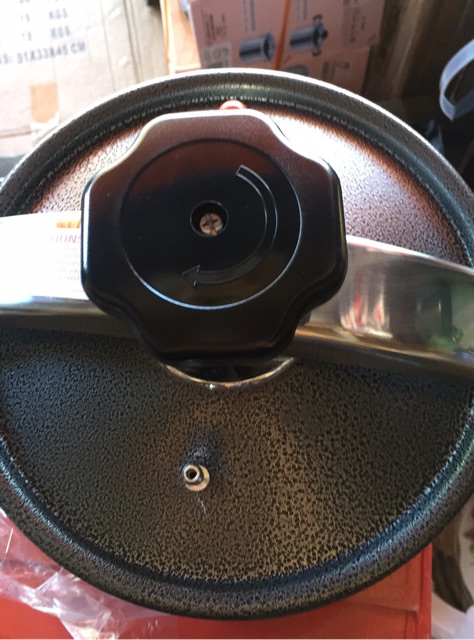 Sau khi cho thức ăn + nước vào rồi xoay nắm đen trên vung theo chiều kim đồng hồ sao cho vung với nồi khít nhau,hai quai gánh vung sát lên cao quai cầm 2 bên.