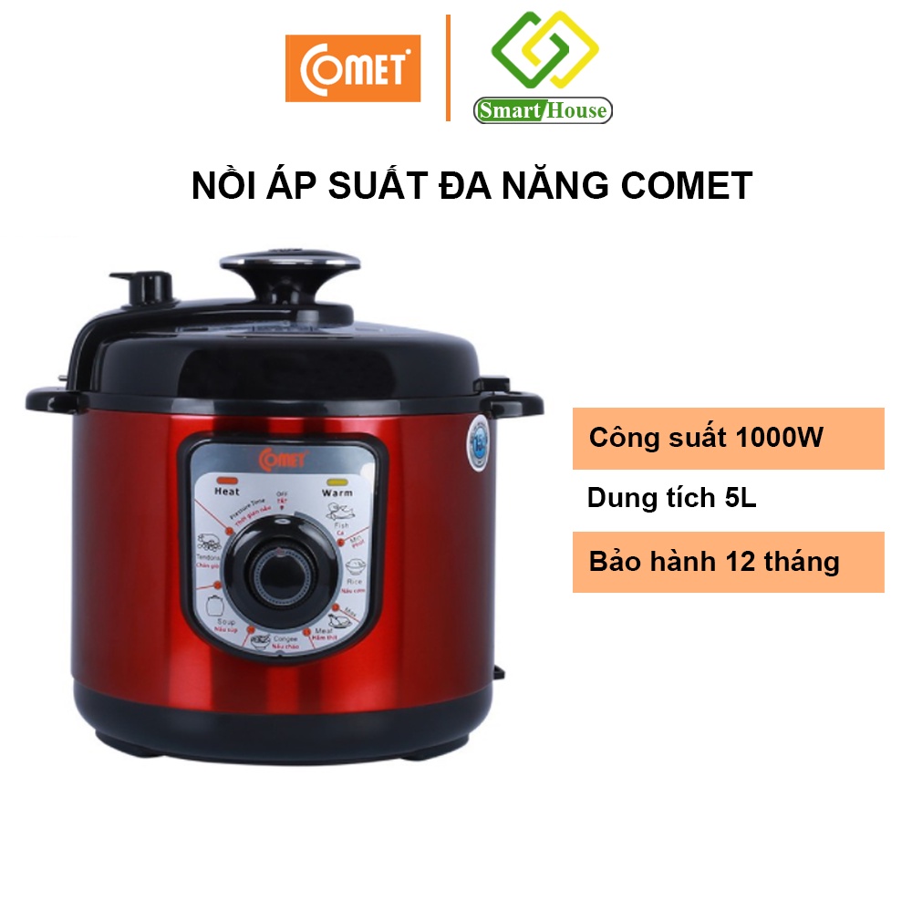 - Nồi áp suất Comet dung tích 5L hỗ trợ bạn nấu và hầm các món ăn trong thời gian ngắn, giúp tiết kiệm thời gian và công sức khi nấu nướng. Nồi với 10 chức năng như hầm đậu, thịt bò, gân, xương và nấu các món cơm, canh, súp, cháo…, thức ăn được nấu bằng nồi áp suất sẽ có vị thơm ngon mà không bị mất chất dinh dưỡng. Nồi áp suất Comet còn có thiết bị điều chỉnh nhiệt và nắp khóa an toàn, đảm bảo an toàn tuyệt đối cho người sử dụng.